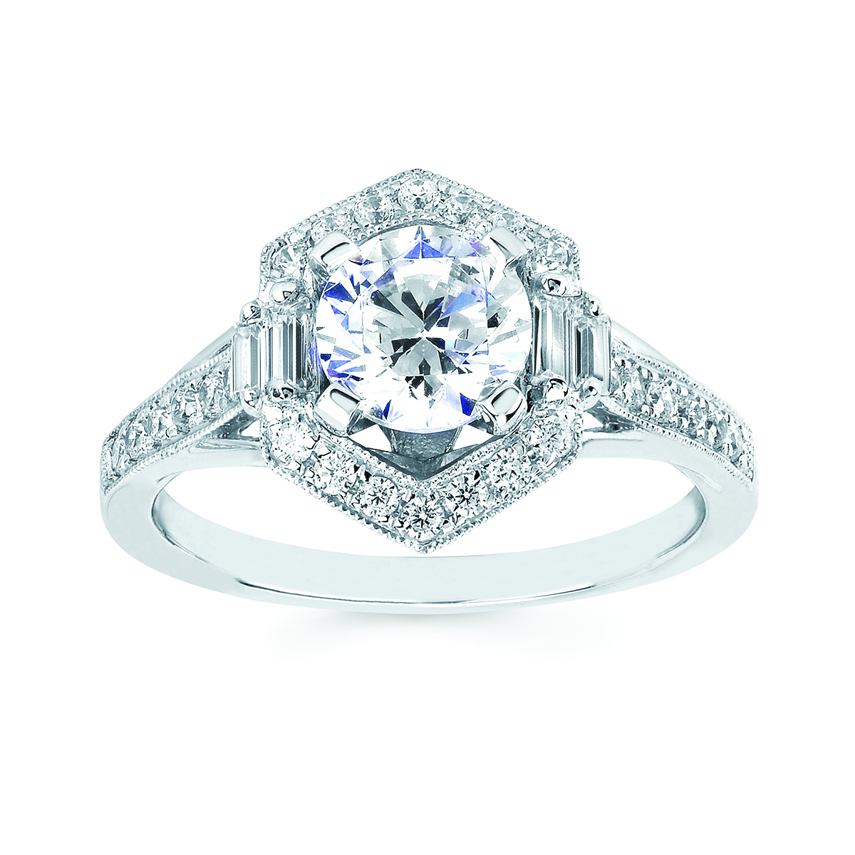 Engagement Ring Forever ElegantĀ® 3/8 Ctw. Diamond Semi Mount shown with 1 Ct. Round Center Diamond in 14K Gold